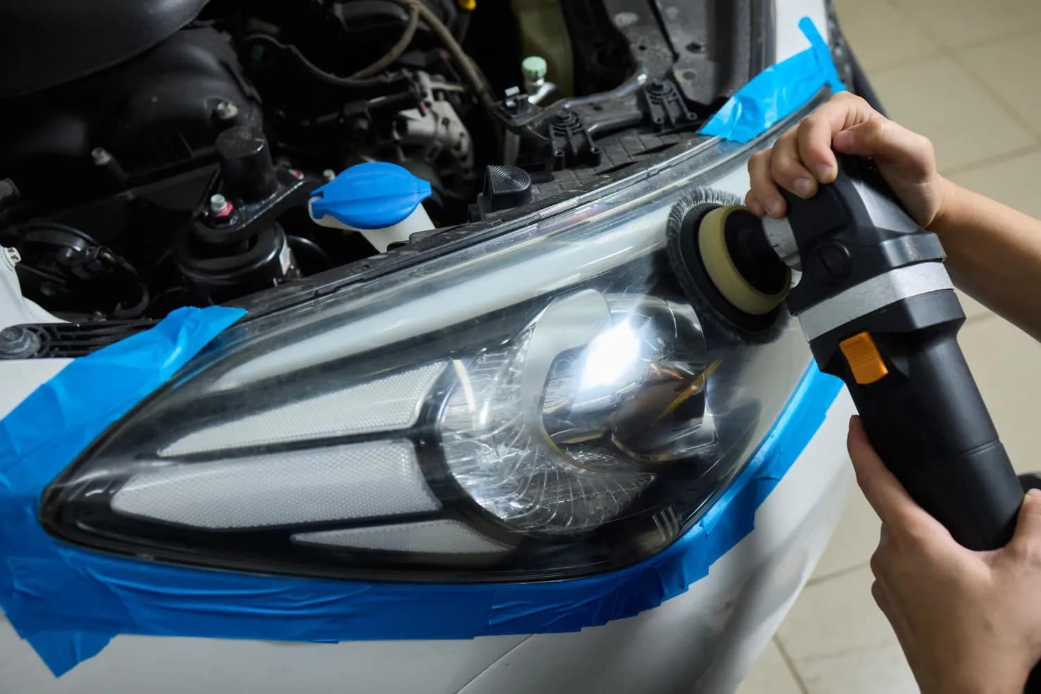 After sanding, the headlight will appear frosty. We use a machine polisher with a specialized cutting compound to remove the sanding marks and begin bringing clarity back to the lens.